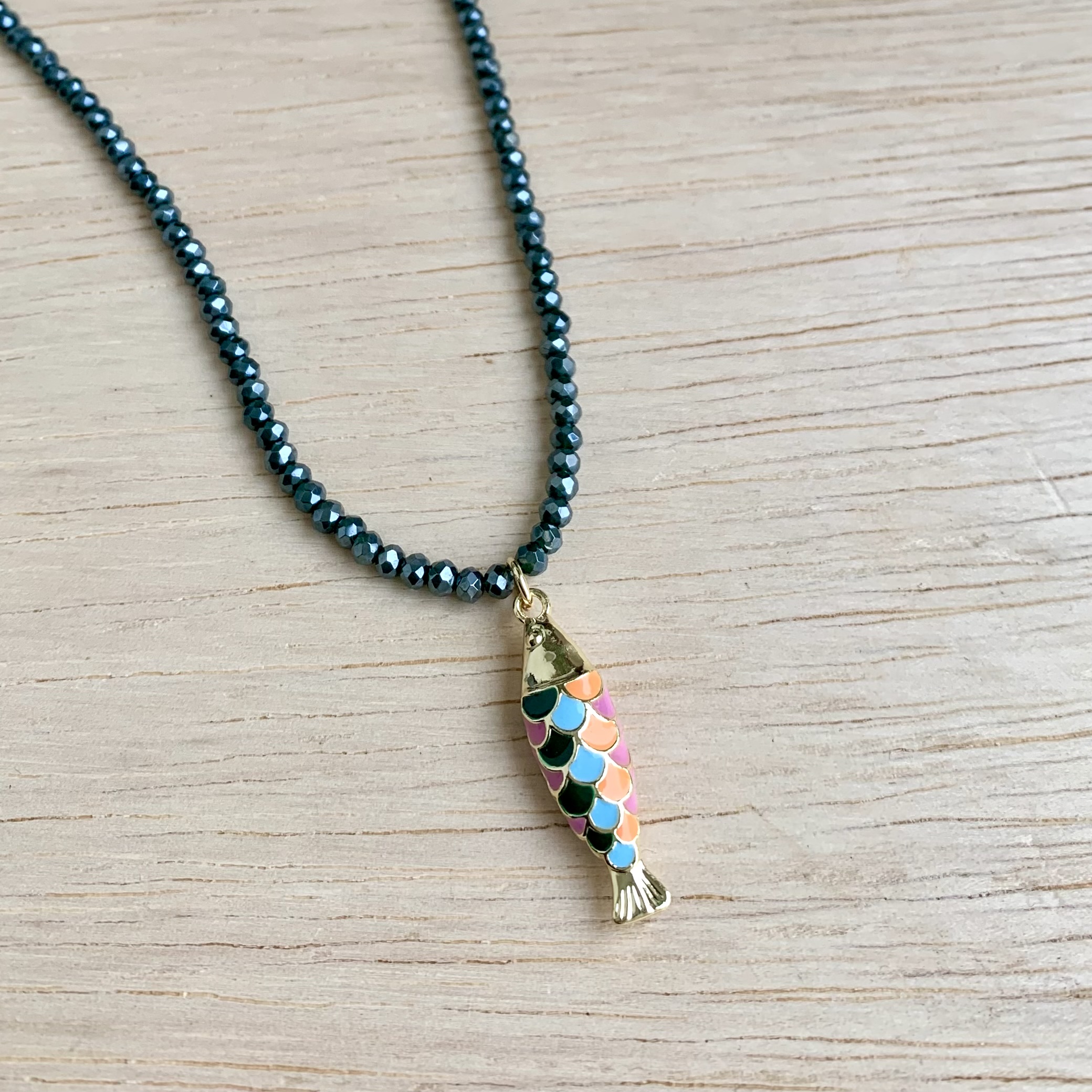 Colar médio confeccionado com cristal de vidro e pingente de peixe esmaltado.
